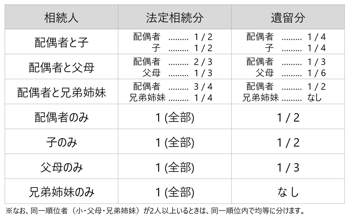 各相続人の法定相続分と遺留分は下の表の通りとなります。