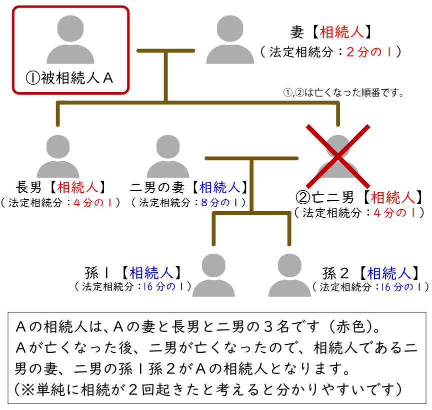 詳しくは、下記の図をご覧ください。具体例2(①~②は亡くなった順番)