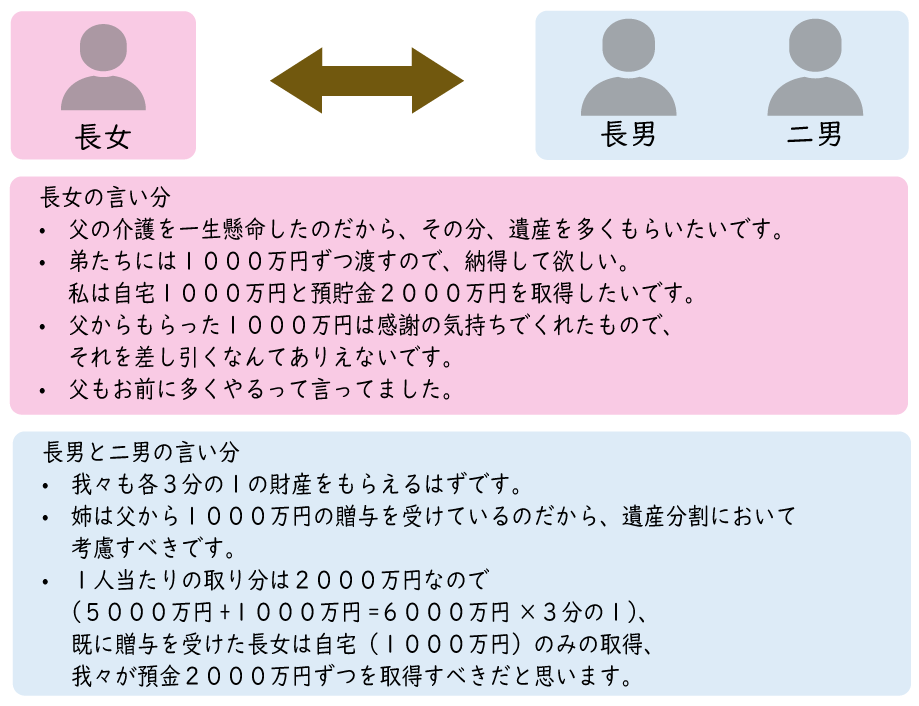 長男、二男の言い分が通りやすいです。(理由)長女がもらった1000万円も遺産に含めて考えられるため(詳しくは「特別受益」をご覧ください)。
